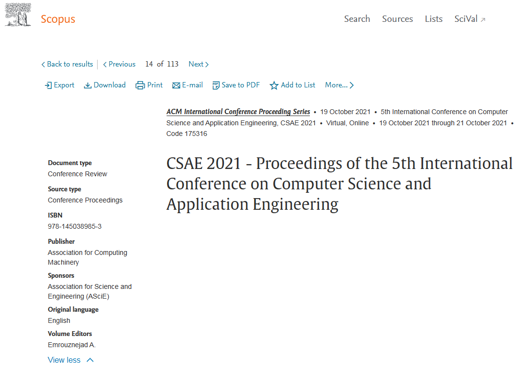 The proceedings of CSAE2021 were published by ACM International Conference Proceedings Series on December 8 , included in ACM digital library, and indexed by EI and Scopus successfully.